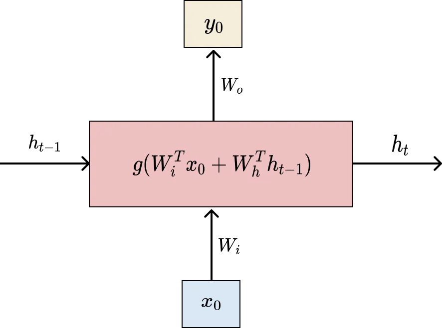 The diagram above is a visual unrolling of the recurrence shown in the eagle’s eye perspective. Note that g is the activation function that provides non-linearity in our neural network. Usually, for RNNs, the most common activation function is the tanh function.